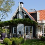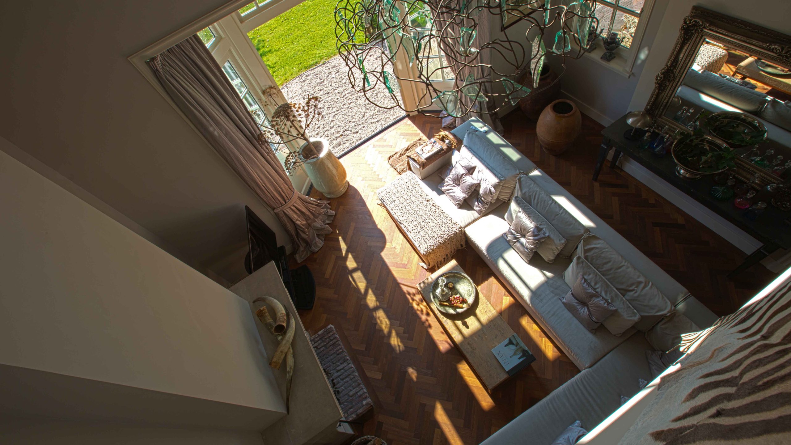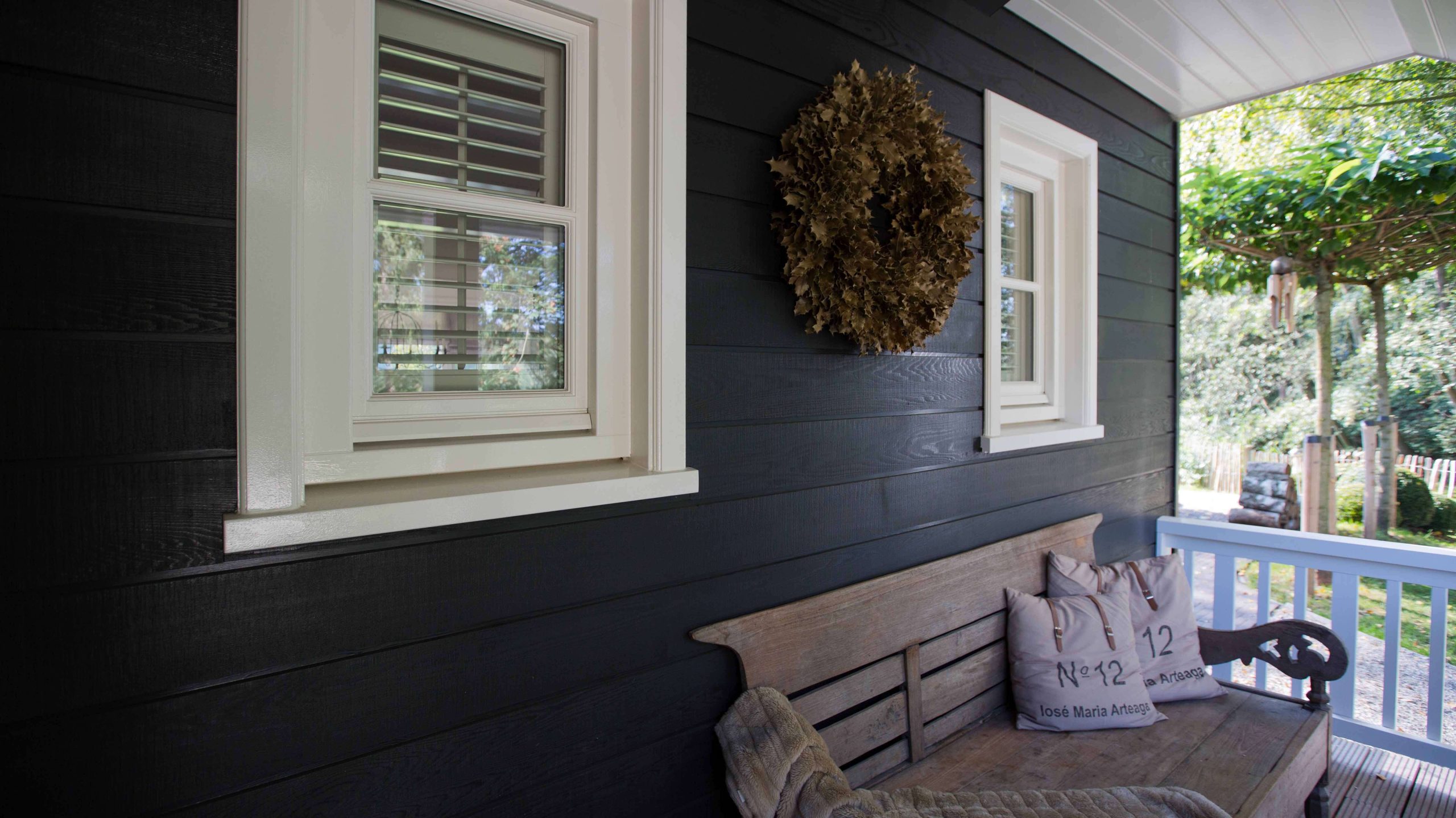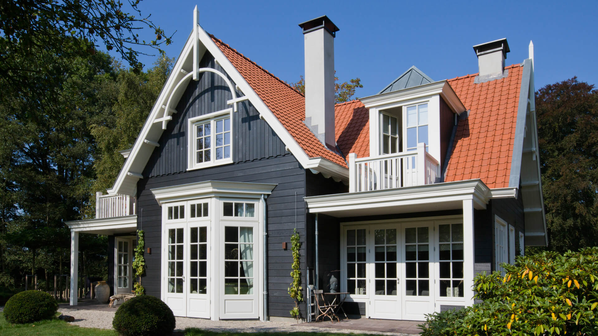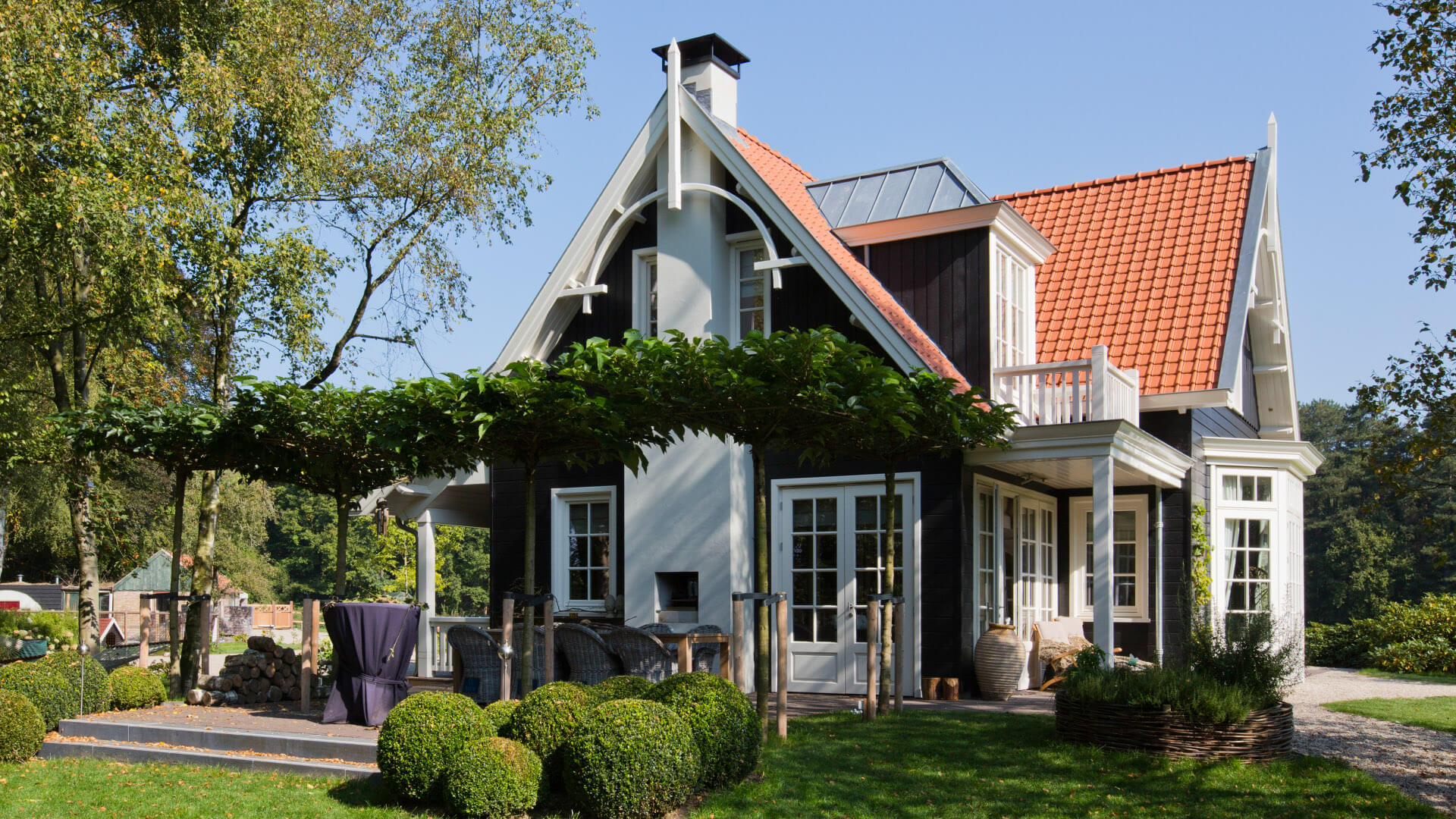 Een sfeervolle woning met zwart houten gepotdekselde gevels, hardhouten authentieke elementen, royale raampartijen en verschillende veranda’s en terrassen die binnen met buiten verbinden. Het geheel heeft een luxueuze uitstraling die een eenheid vormt met de unieke omgeving.